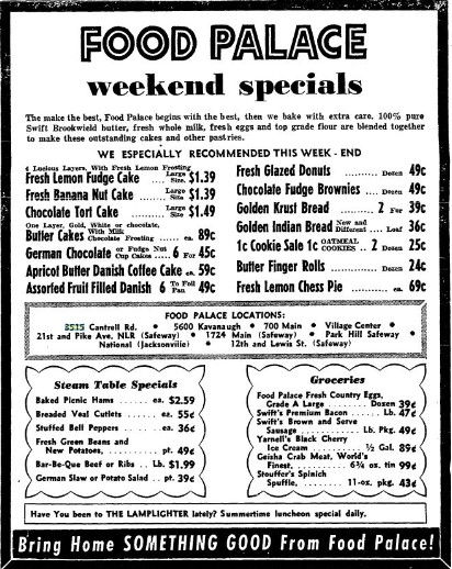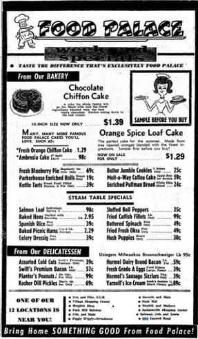 1960: The business appears to have rebranded as Food Palace Bakery, with a help-wanted ad seeking a bakery saleslady.